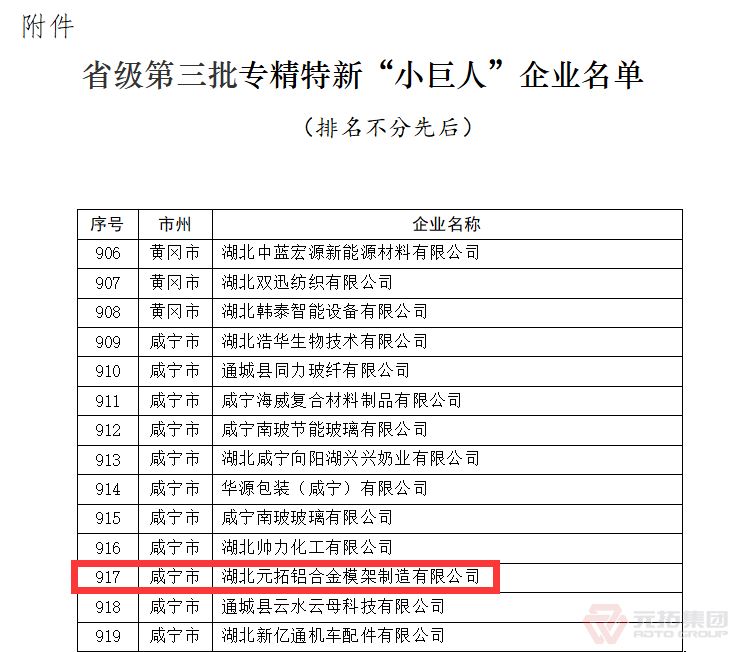 近日,湖北省经济和信息化厅公布了2021年省级第三批专精特新“小巨人”企业名单,元拓建材集团旗下子公司湖北元拓铝合金模架制造有限公司(以下简称“湖北元拓”)成功入围。