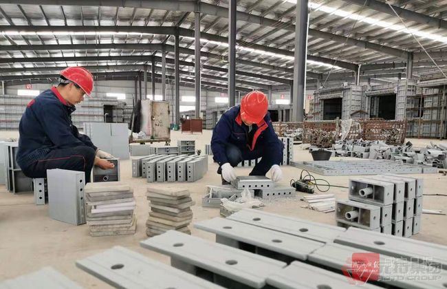 “生产包括6道工序,分别是抛丸、切割打孔、焊接、打磨、喷涂、拼装。完成6道工序,按照甲方图纸我们做出了施工模板,等待甲方验收合格,打包发往甲方施工现场。”厂长游练兵指着旁边的模板介绍。