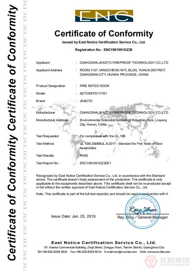 捷坤元拓钢质防火门采用优质冷轧钢板、镀锌钢板或不锈钢钢板轧制或焊接而成,门扇内置防火板和耐高温、无毒无害的防火芯材,配置防火五金配件,具有良好的防火耐热性能。钢质表面采用静电喷塑,美观、大气、耐用,深受国内外客户喜爱。此次获得美国UL认证,是国际权威机构对捷坤元拓卓越品质的高度认可,将有力促进捷坤元拓品牌影响力的提升和国际市场的开拓。