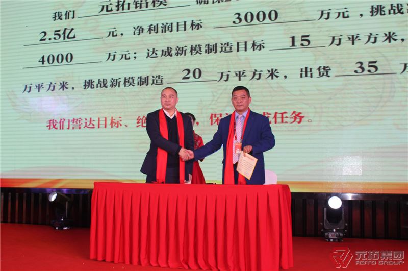 现场,集团董事长游炎明与三大业务板块领头人签订了2019年度经营目标挑战承诺书,三位领头人再把任务进行详细分解并与下属团队负责人签署了目标责任书。全体业务、生产骨干纷纷在台上宣誓,2019年将全力以赴,坚决完成挑战目标。