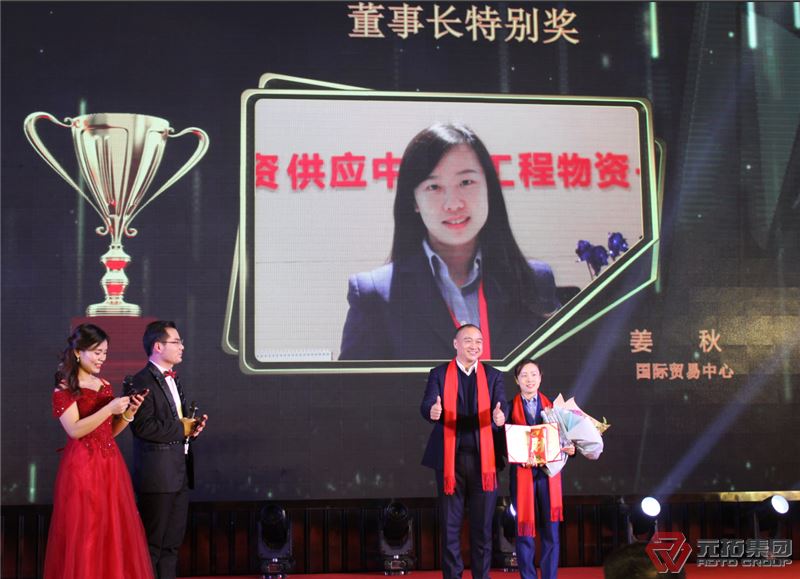 会上还对集团优秀员工、营销精英、优秀团队分别进行了表彰颁奖。值得一提的是,集团国际贸易中心姜秋凭借年度高业绩以及优秀的领导能力获得“董事长特别奖”。